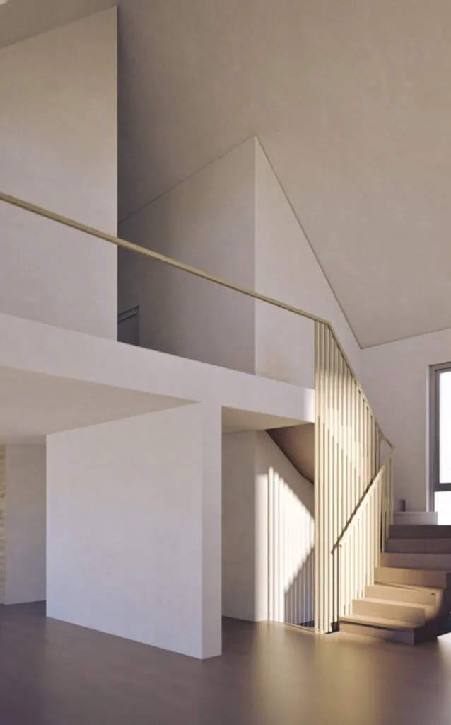 Seitlich öffnen sich großzügige Glasfronten, die einen fließenden Übergang in den Freibereich ermöglichen. So entstehen helle, gut proportionierte Räume, die Wohnkomfort und die Nutzung als Atelier gleichermaßen unterstützen. Die klare, ruhige Architektur sorgt für eine angenehme und funktionale Atmosphäre.